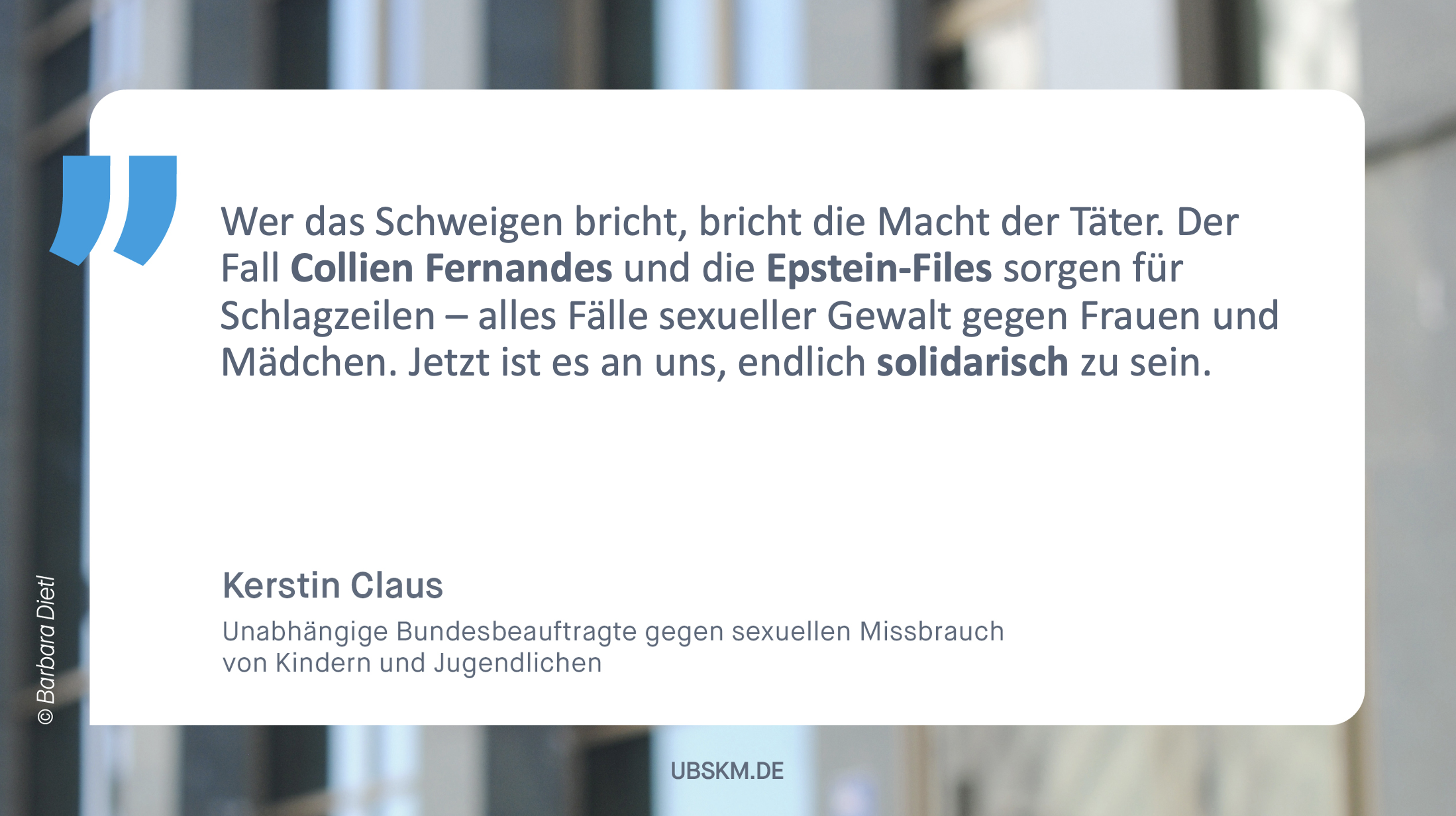 Jede und jeder kennt Betroffene. Alle kennen Täter, manchmal auch Täterinnen. Es sei an uns, so Kerstin Claus, die Bundesbeauftragte gegen sexuellen Missbrauch von Kindern und Jugendlichen, ob die Scham endlich die Seite wechseln könne.