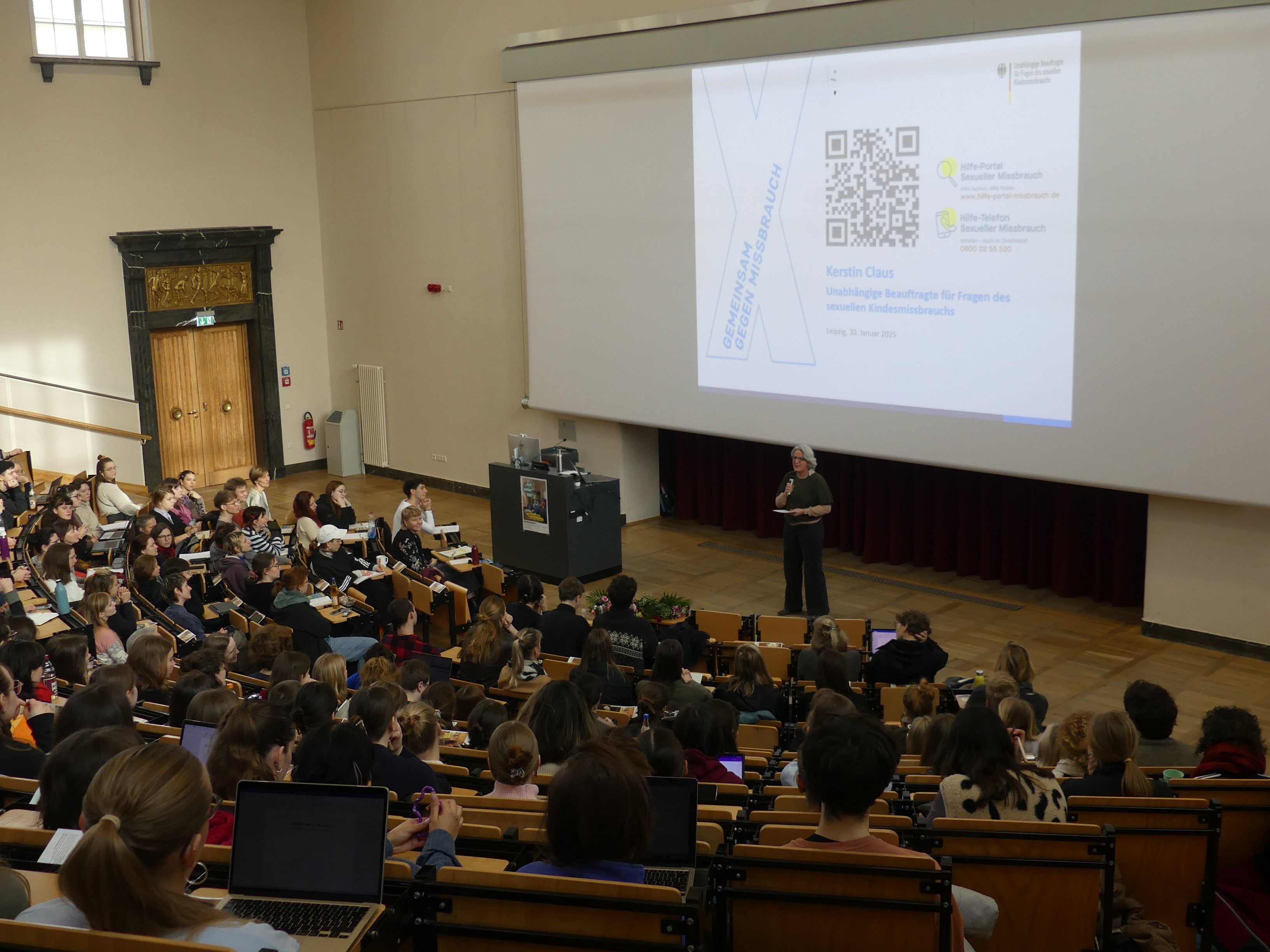 Leipzig, 30.01.2025. Wie können Lehrkräfte sensibel und angemessen mit dem Thema Kindesmissbrauch umgehen? Woran erkennen sie möglicherweise betroffene Kinder, und wie sprechen sie diese an, ohne Schaden zu verursachen? Diese und weitere drängende Fragen standen im Mittelpunkt der Veranstaltung „Schau hin – Hör zu – Frag nach: Kindesmissbrauch als Lehrperson erkennen,“ die heute im Großen Hörsaal der Universität Leipzig stattfand. Rund 500 angehende Lehrkräfte, Dozierende und weitere Interessierte nahmen an der bereits dritten Auflage der Veranstaltungsreihe teil, die vom Student:innenrat der Universität Leipzig in Kooperation mit dem Kinderschutzbund Sachsen organisiert wurde.