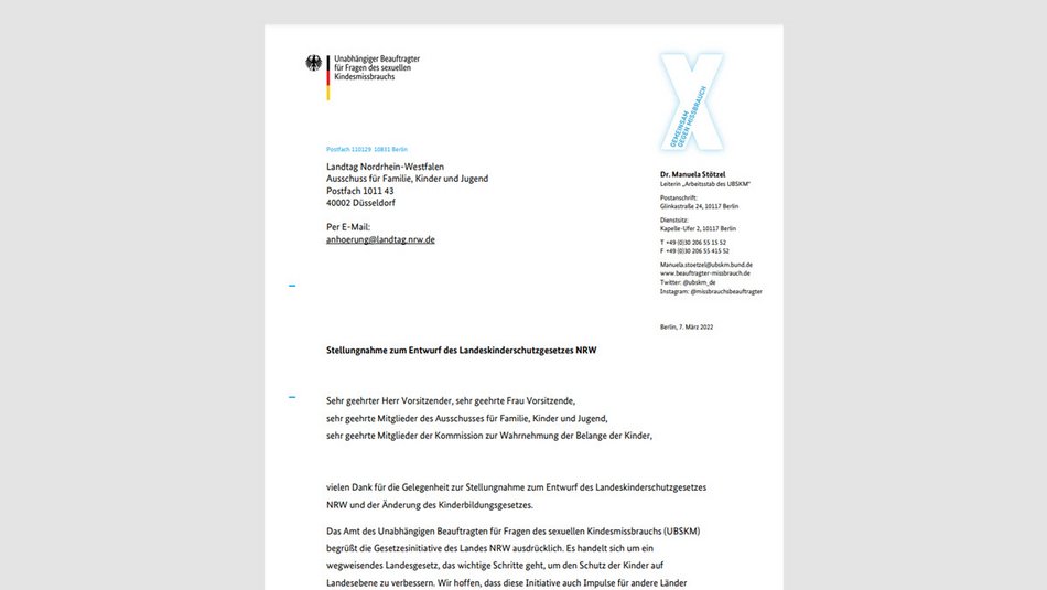 Anlässlich der Anhörung im Landtag Nordrhein-Westfalen am 10. März 2022 zum Kinderschutzgesetz hat das UBSKM-Amt eine Stellungnahme abgegeben. Das UBSKM-Amt begrüßt die Initiative eines Landeskinderschutzgesetzes.